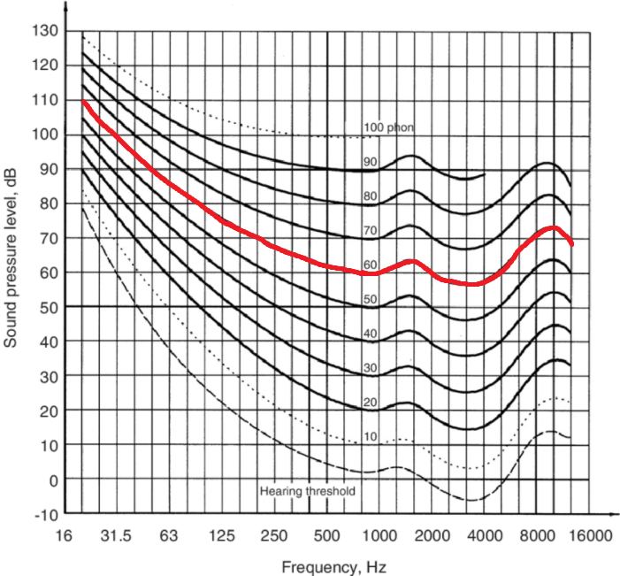 60 Hz에서 60dB SPL의 음압으로 재생해야하지만 우리의 귀에 40 phon 으로 들리게 됩니다.