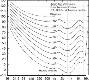전체 오디오범위에 대해서 귀에 민감 혹은 민감하지 못한 주파수 특성을 연구,도표화 하였는데 이것이 바로
