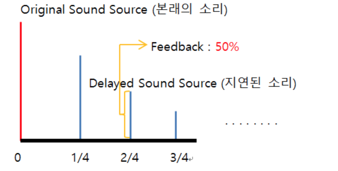 지연된 소리(Delayed Sound Sourece)가 반복되는 정도를 조절하는 파라미터입니다.