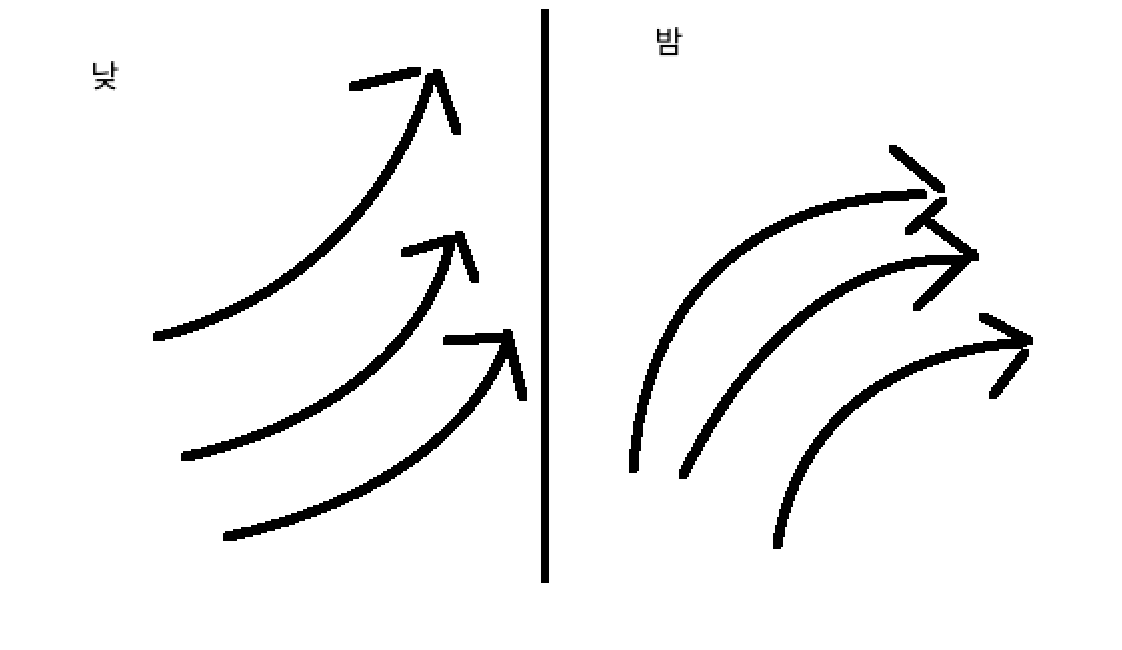 밤에는 지표면의 공기가 주위보다 차가우므로 낮과 반대가 됩니다.