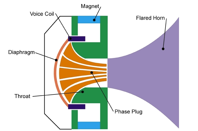 진동판과 코일은 돔 드라이버와 유사하지만 밀폐된 구조를 지니며 출구에 높은 음향 임피던스가
