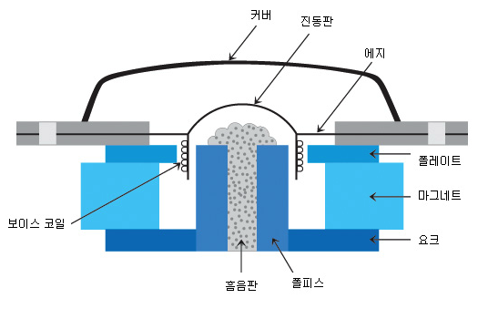 이 코일이 영구자석이 만드는 자기장 내에 위치하여 진동판의 움직임을 만든다.