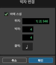 1박 하단을 보면 4/4라고 적혀 있는 곳을 더블 클릭하면 마디를 변경하는 창이 뜨게 됩니다.